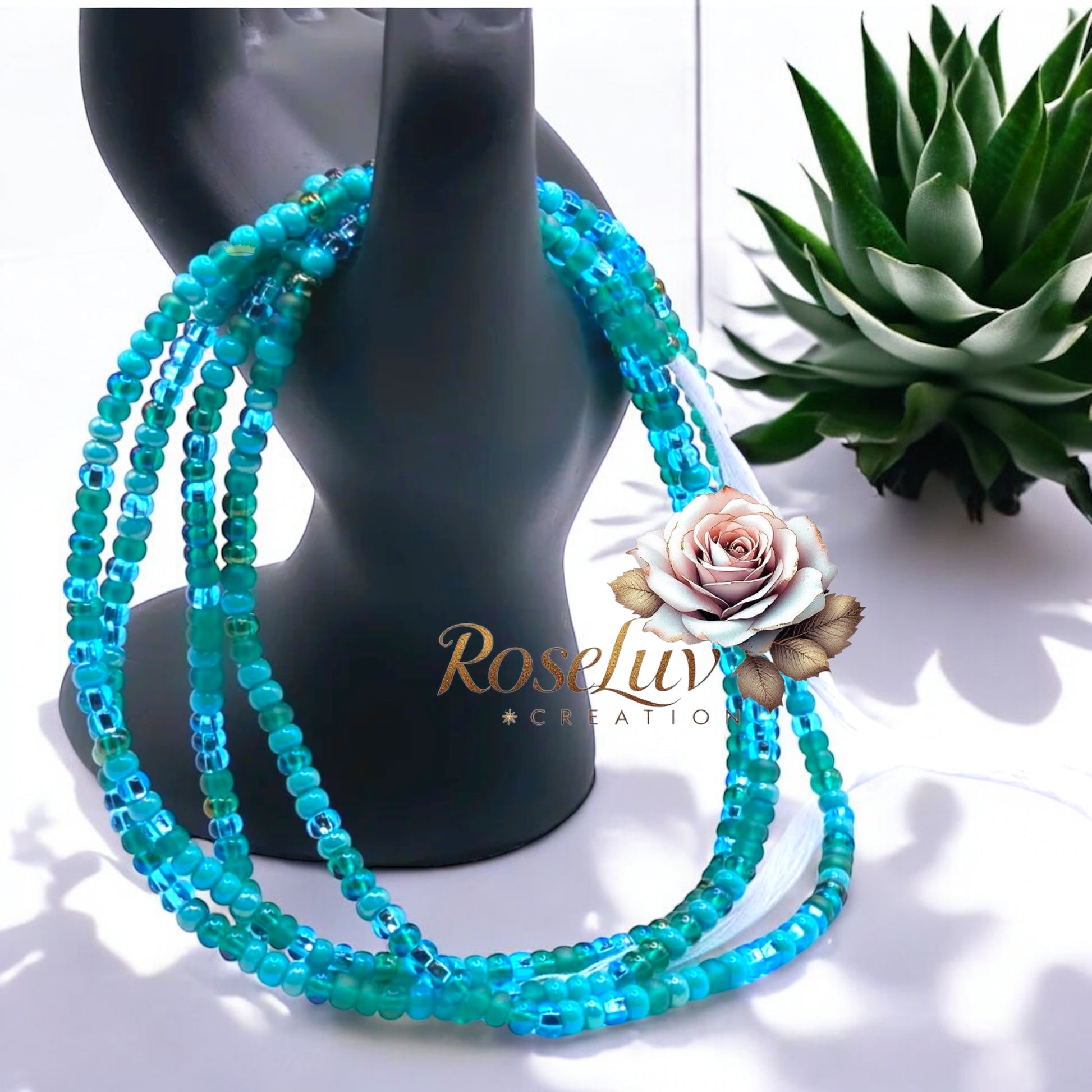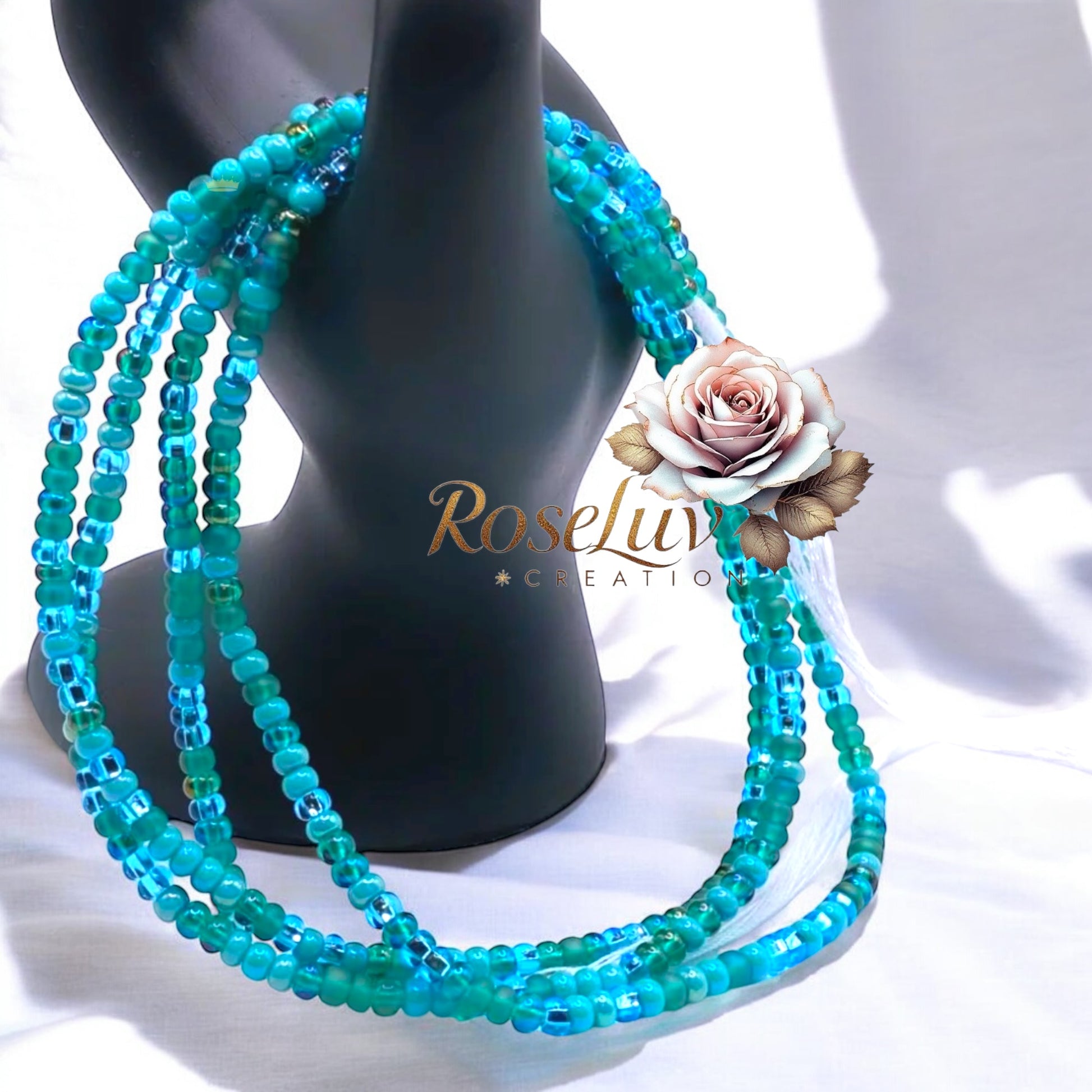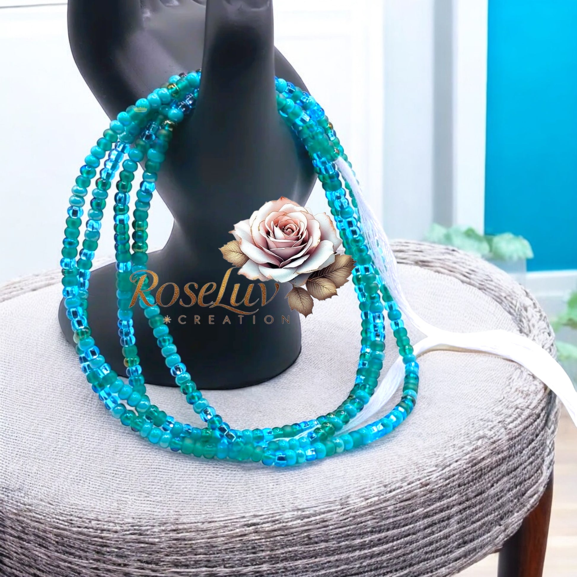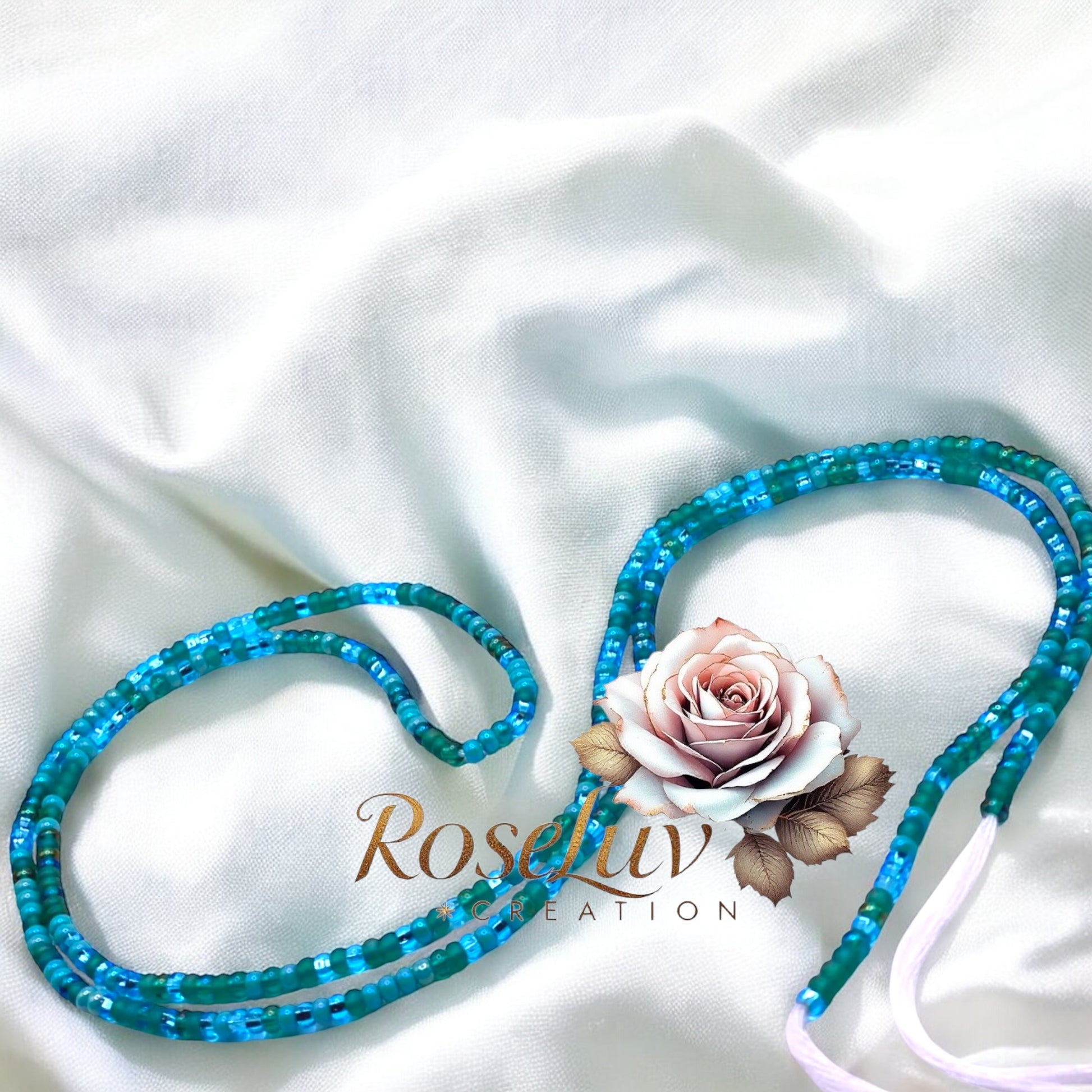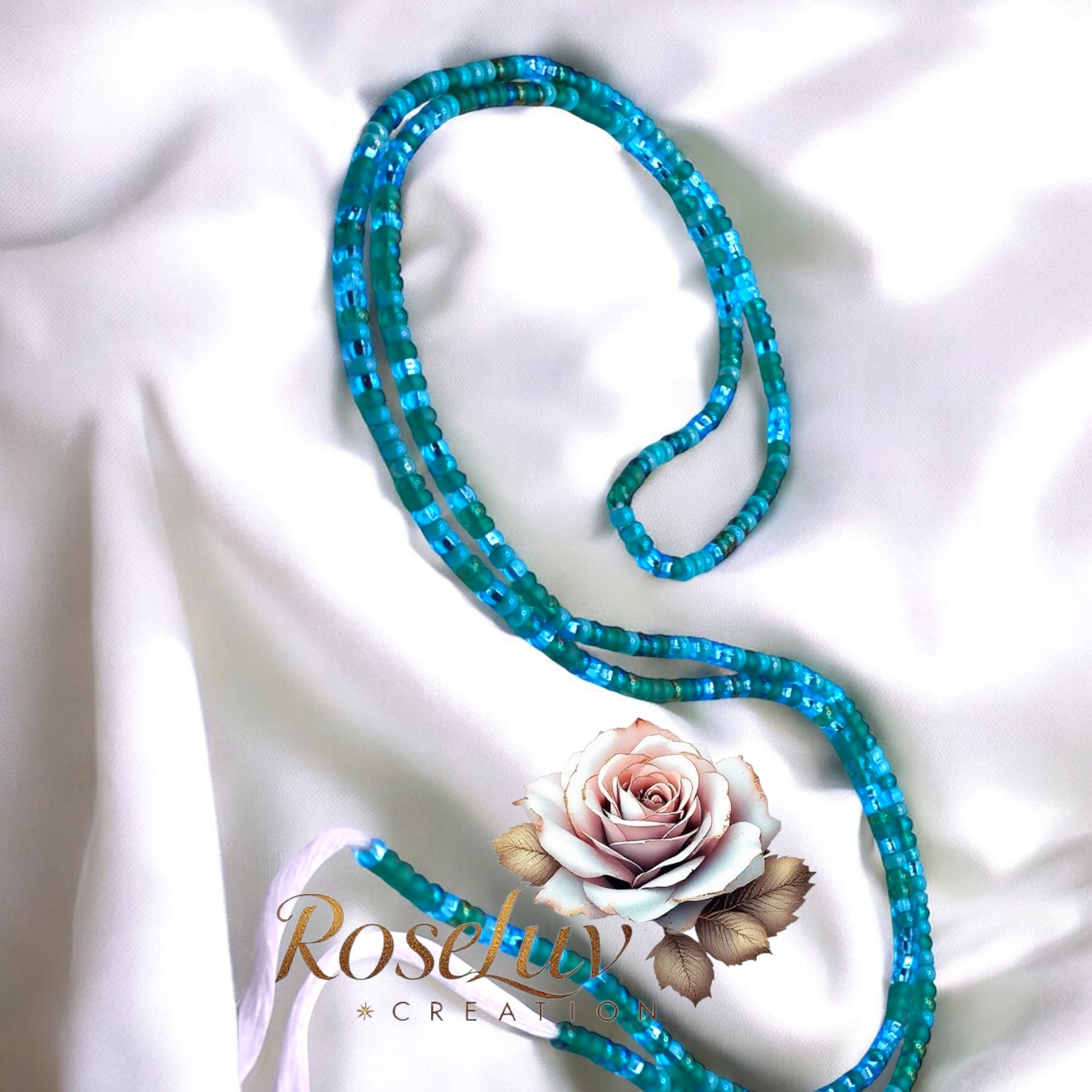 Plongez dans la fraîcheur apaisante des eaux tropicales avec la perle de taille Azura. Composée de perles en verre aux nuances vibrantes de bleu et de vert turquoise, cette pièce évoque la sérénité de l’océan et l’énergie fluide des vagues. À la fois légère et captivante, Azura sublime la taille avec élégance, idéale pour exprimer votre féminité avec une touche de mystère et de fraîcheur.