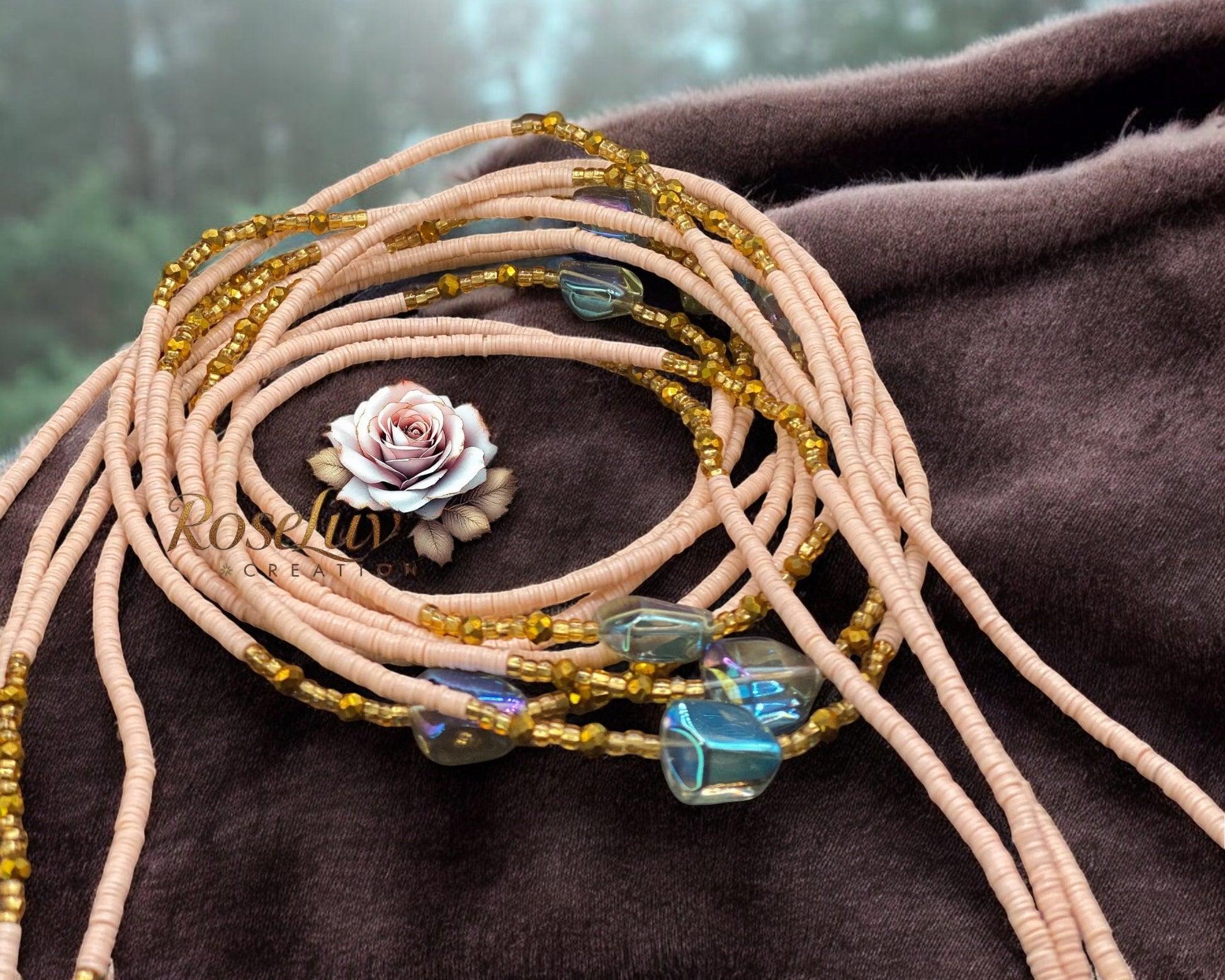 Placez la perle de taille autour de votre taille, à l’endroit où vous souhaitez qu’elle repose (au niveau de la taille haute, des hanches ou du bas-ventre selon votre préférence). - Ajustez la longueur