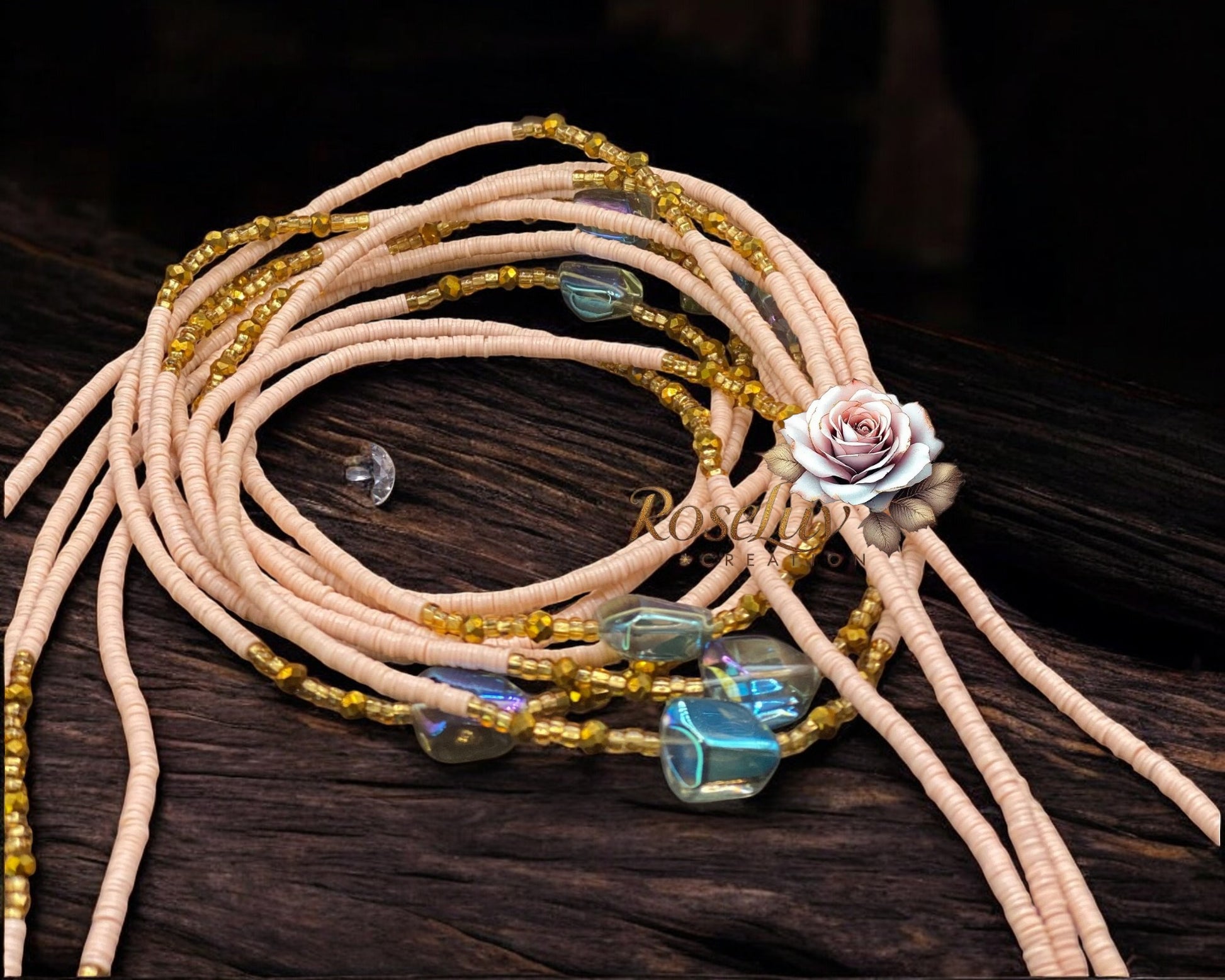 Raffinement et douceur se rencontrent dans ce baya "Belinda" Composé de perles vinyles nude subtilement associées à des perles dorées scintillantes et des accents en verre irisé, ce baya incarne la féminité discrète et l’élégance naturelle.