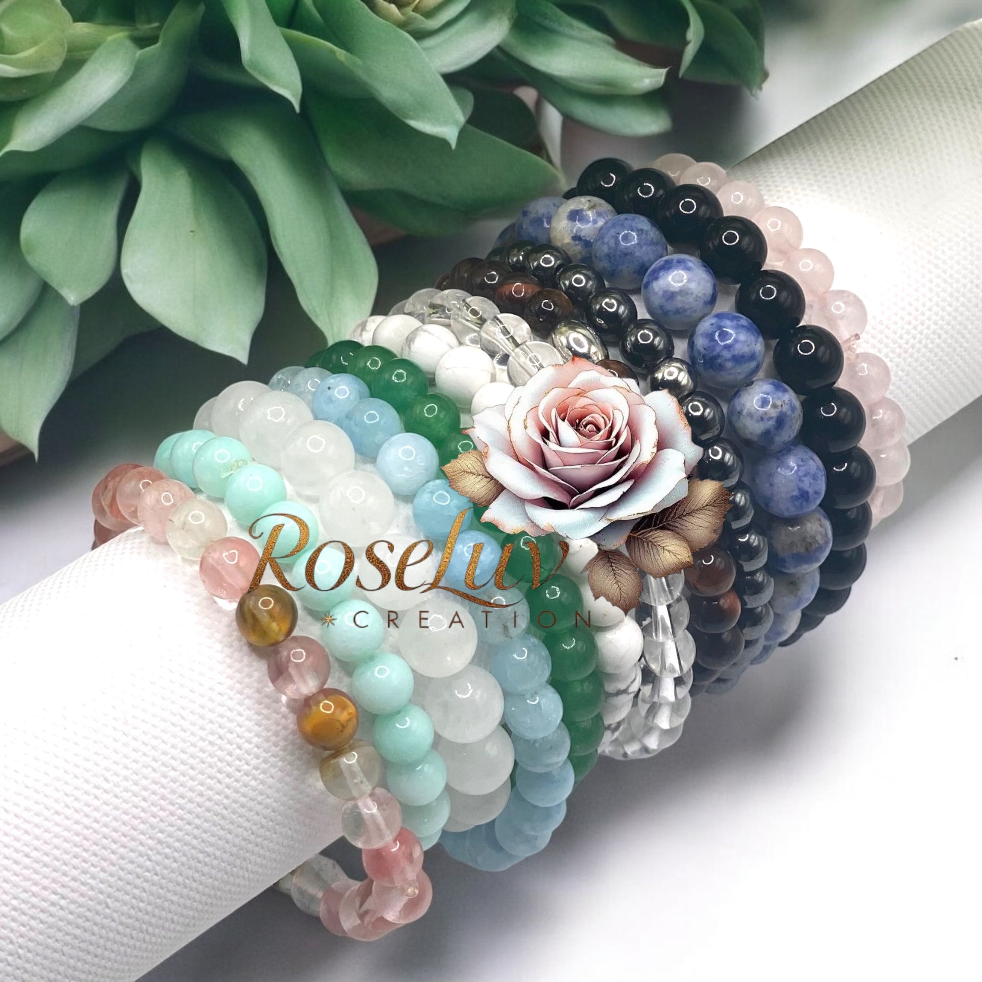- Matériau : Pierres ( quartz rose, hématite, œil de tigre, sodalite, amazonite, aventurine, cristal de roche, etc.)