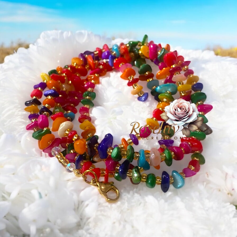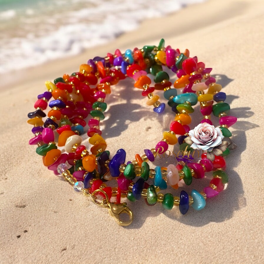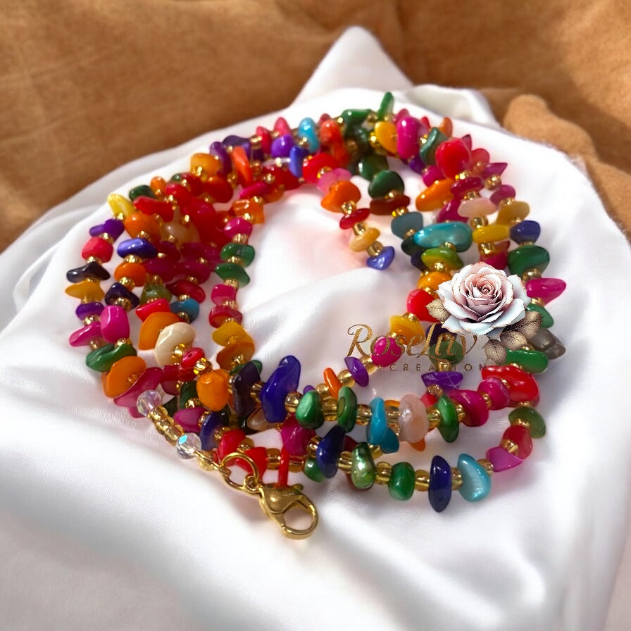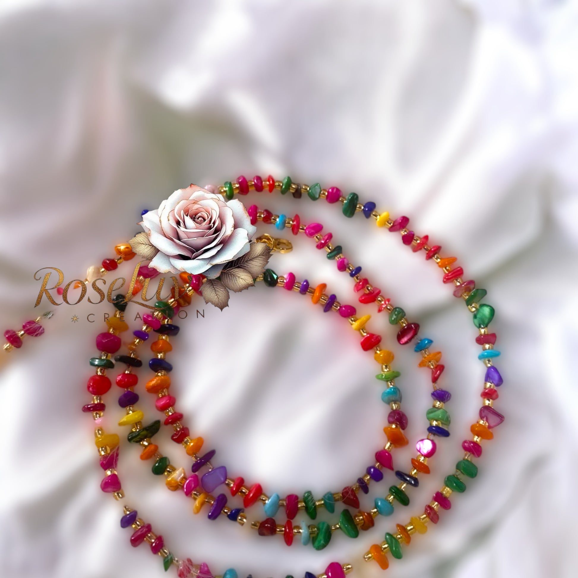 Sublimez votre taille avec ce magnifique perle de taille multicolore fait à la main. Composées de perles chips colorées associées à de délicates perles dorées, ces perles de taille apportent élégance, sensualité et une touche vibrante à votre corps.