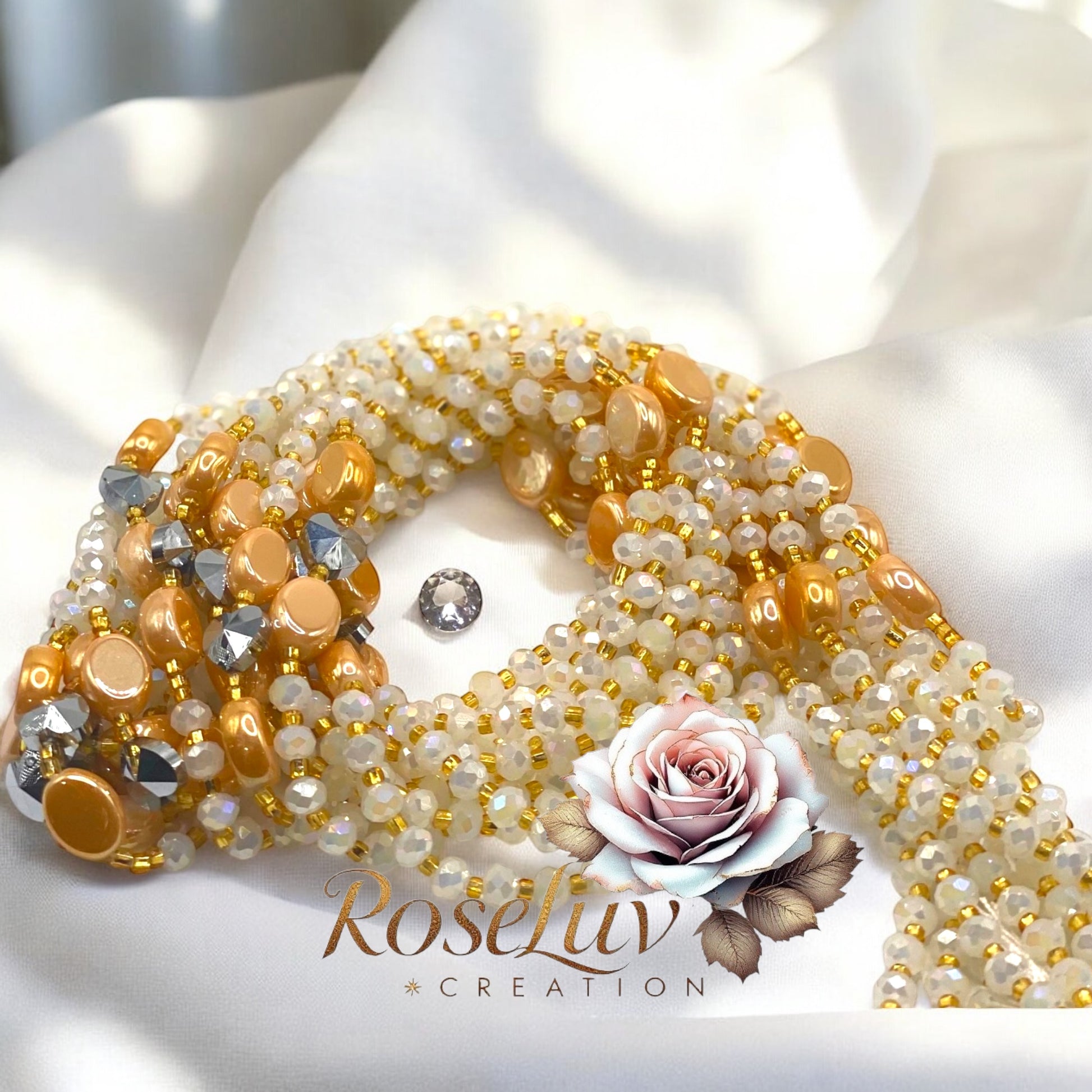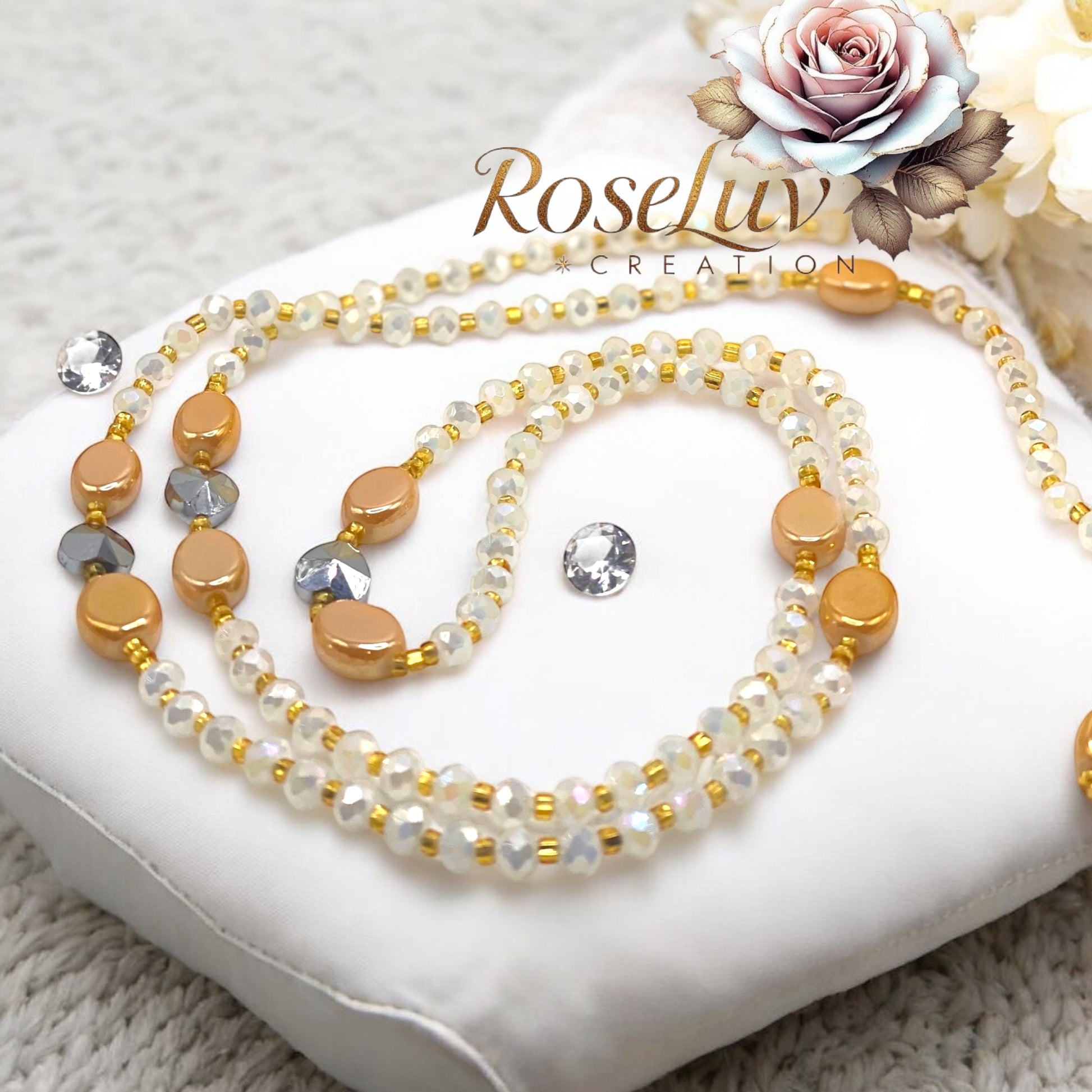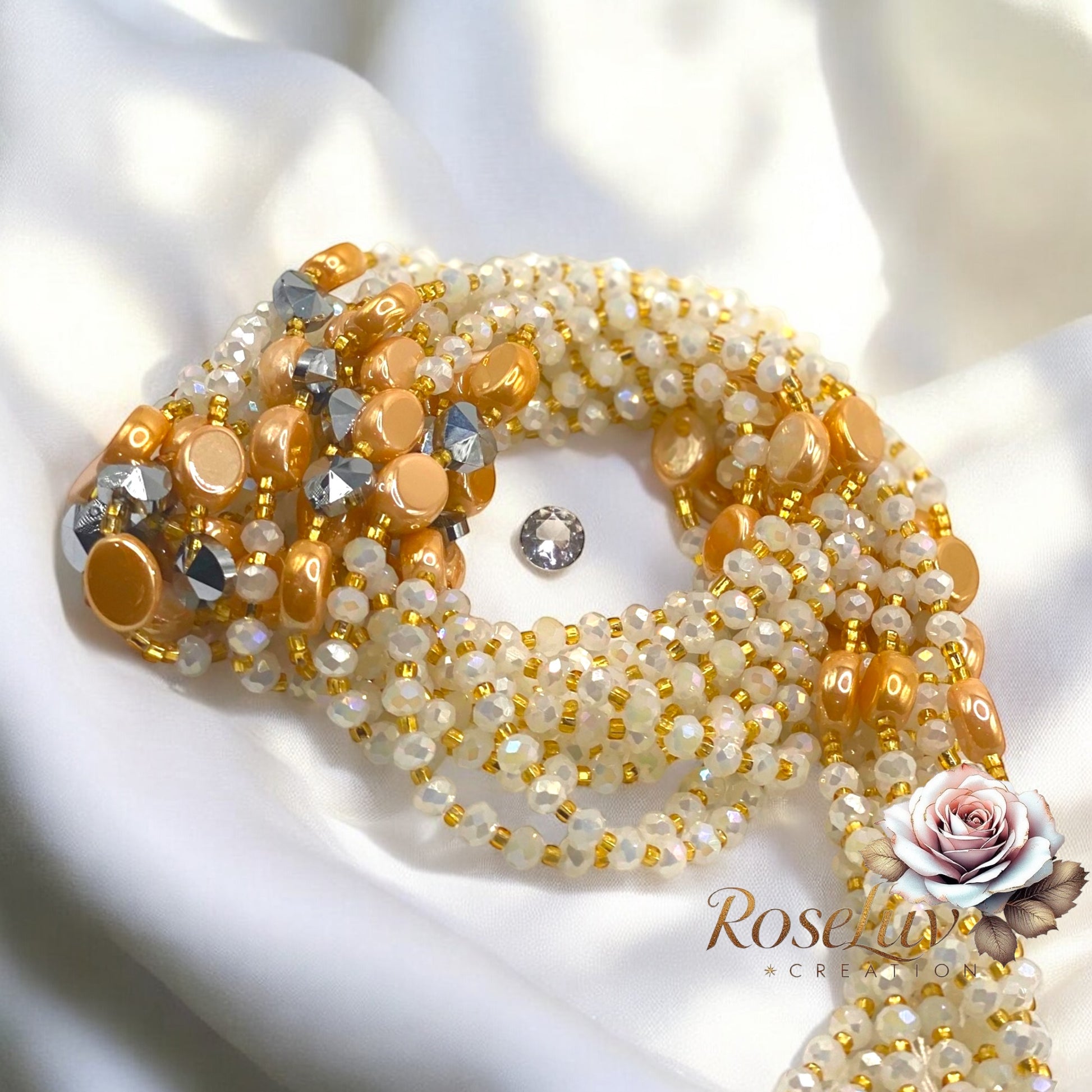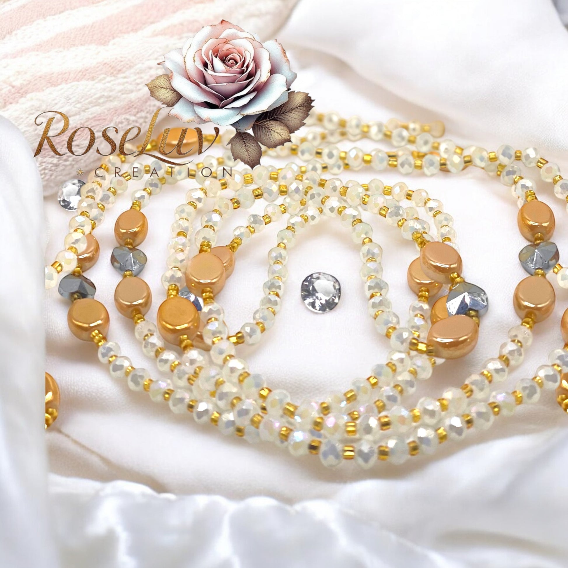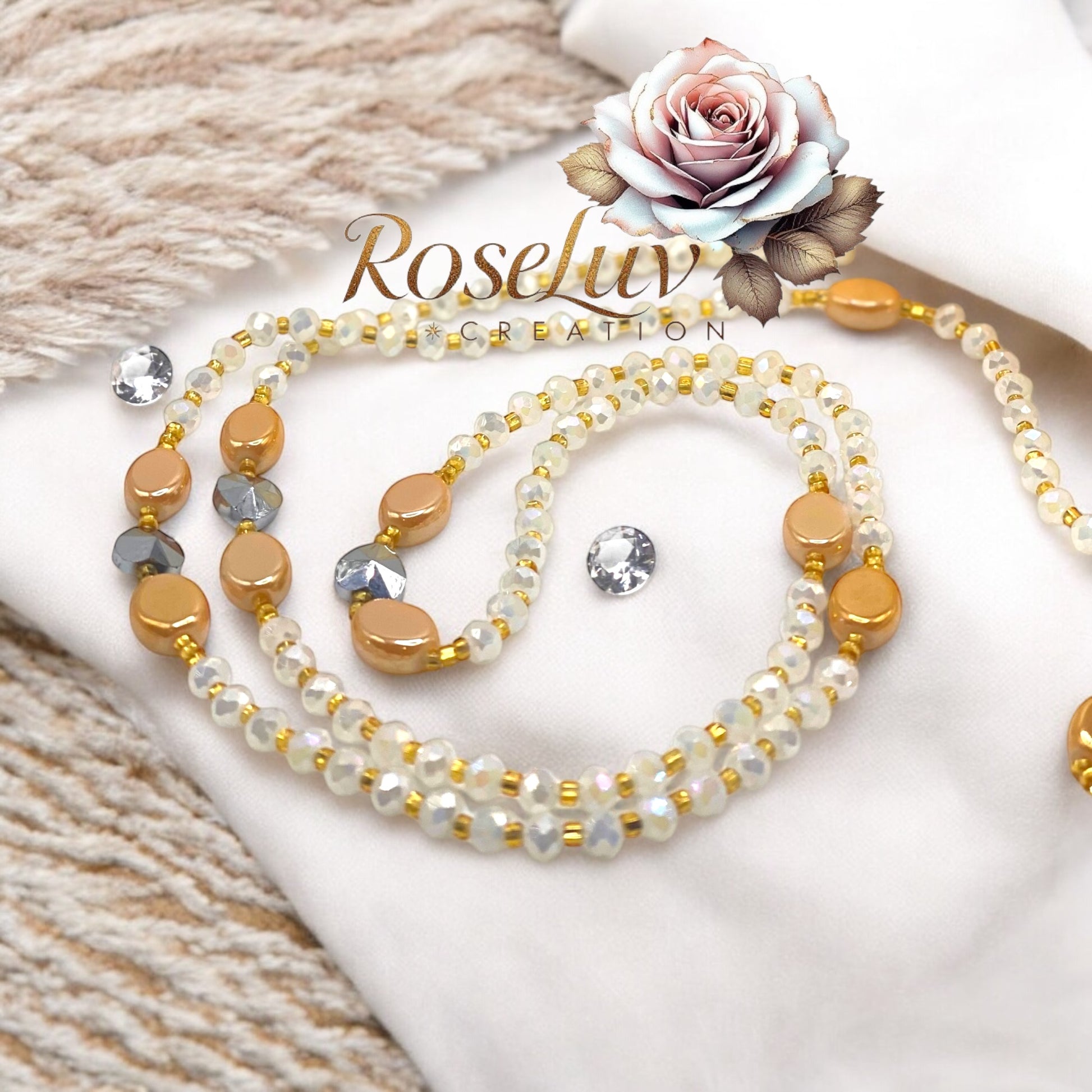 Cristal d’Ivoire est une perle de taille douce et lumineuse, pensée pour sublimer la peau avec élégance. Elle mêle des cristaux nacrés aux reflets irisés, des perles dorées et des pastilles beiges satinées pour créer une harmonie délicate et sophistiquée. À la fois épurée et précieuse, cette chaîne de taille évoque la douceur de l’ivoire et l’éclat du cristal, parfaite pour les femmes en quête de raffinement discret et intemporel.