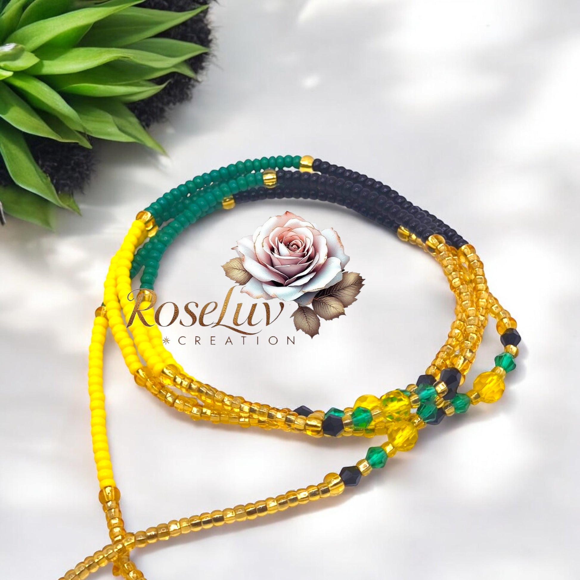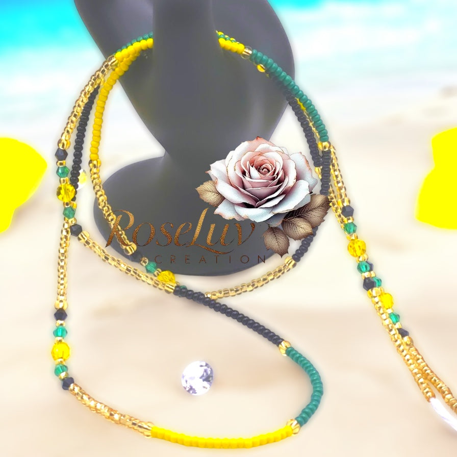 Plongez dans l’esprit vibrant des Caraïbes avec la perle de taille Jamaica. Inspirée des couleurs emblématiques du drapeau jamaïcain, cette chaîne de taille mêle harmonieusement des perles noires, vertes, jaunes et dorées pour symboliser la force, l’espoir, la lumière et la richesse. Chaque segment est soigneusement agencé avec des cristaux brillants et des perles dorées qui capturent la lumière et évoquent la chaleur du soleil tropical. Portée autour de la taille, Jamaica incarne la liberté, la fierté culturelle et la beauté naturelle.