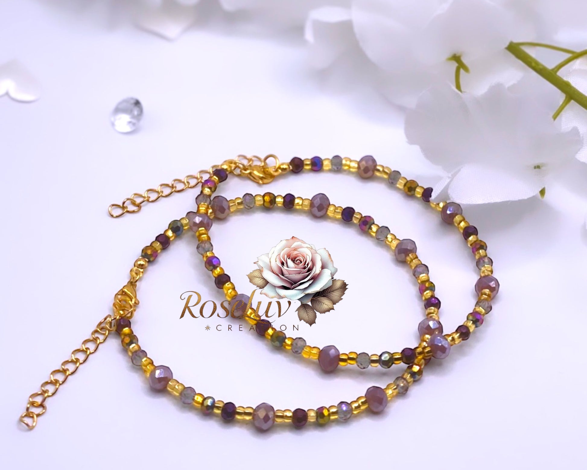 Le bracelet de cheville Myca séduit par son éclat discret et sa palette envoûtante. Composé de cristaux facettées aux reflets mauves, dorés et irisés, il capte la lumière à chaque mouvement. Les touches dorées apportent une élégance raffinée, tandis que les nuances profondes de violet et de bronze ajoutent un charme mystique. Parfait pour sublimer la cheville avec subtilité, Myca est un bijou à la fois chic, doux et captivant.