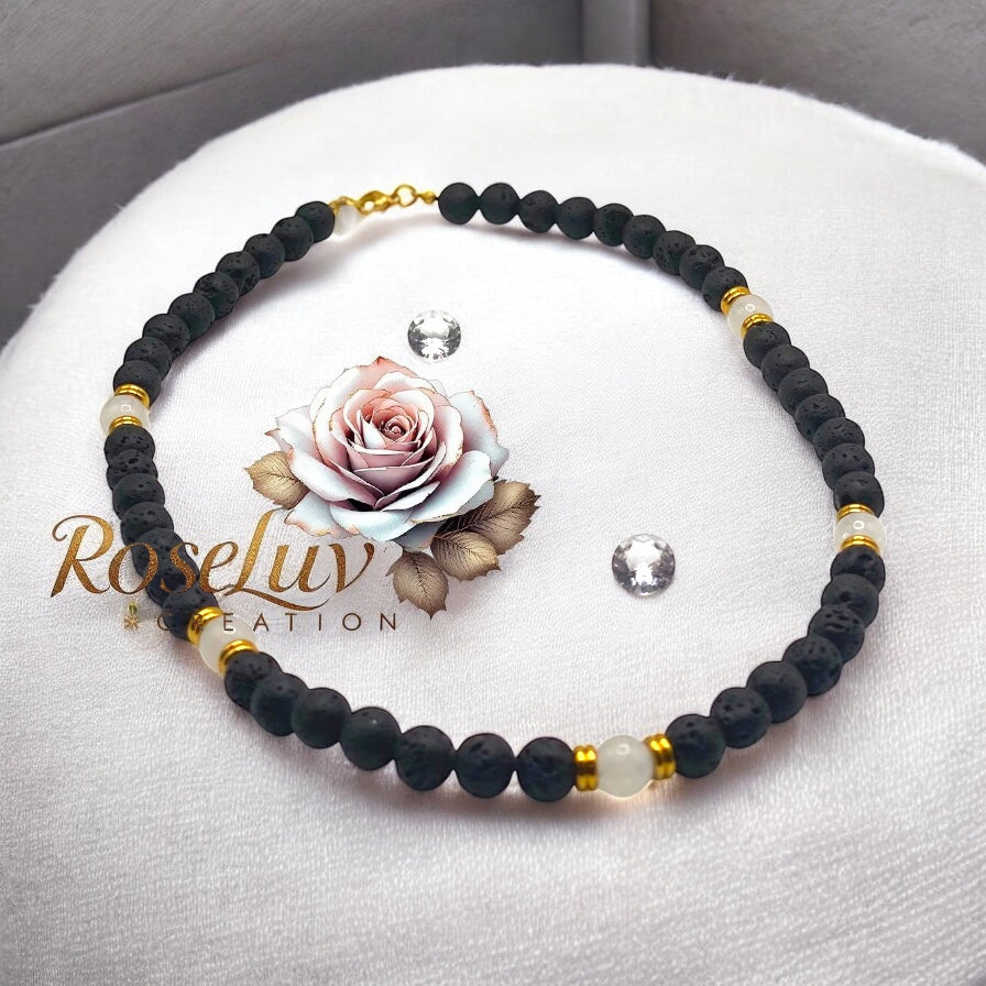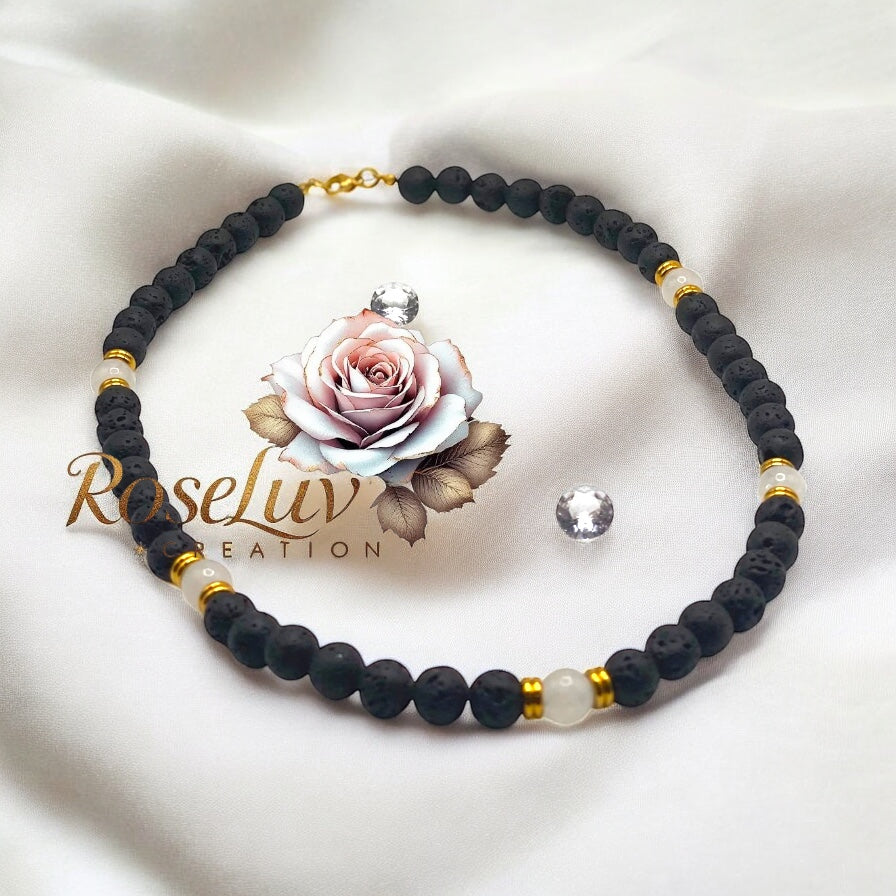Élégant et intemporel, le collier Nocta marie l’intensité des pierres de lave noires à la douceur mystique de la pierre de lune blanche. Chaque perle est soigneusement sélectionnée pour offrir un équilibre entre force et harmonie. Les accents dorés ajoutent une touche de lumière à cette pièce qui allie style, énergie et symbolisme. Idéal pour les esprits libres en quête d’élégance et de sens.