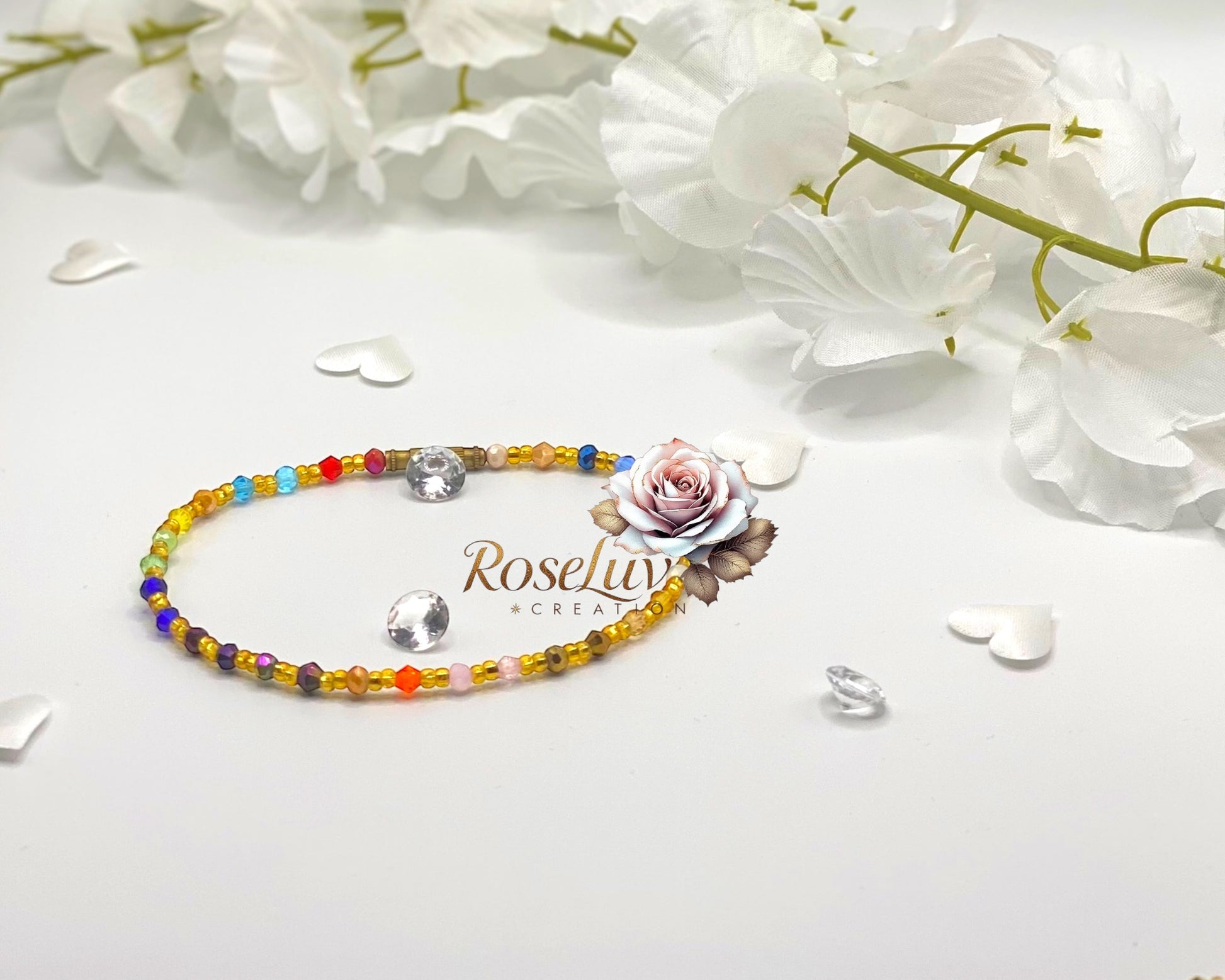 Laissez briller votre lumière avec ce bracelet de cheville “Rainbow Glow”, une explosion de couleurs et de joie. Composé de perles fines aux teintes vibrantes de l’arc-en-ciel et de touches dorées éclatantes, il symbolise l’équilibre, la diversité et la positivité.