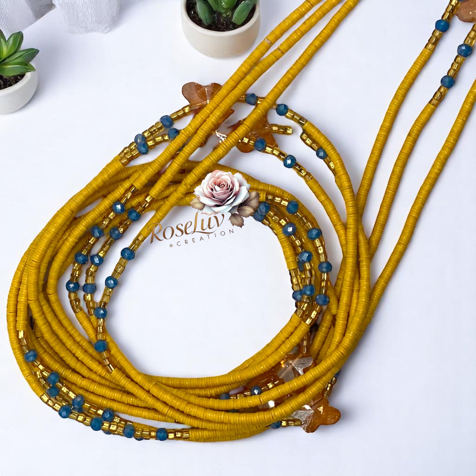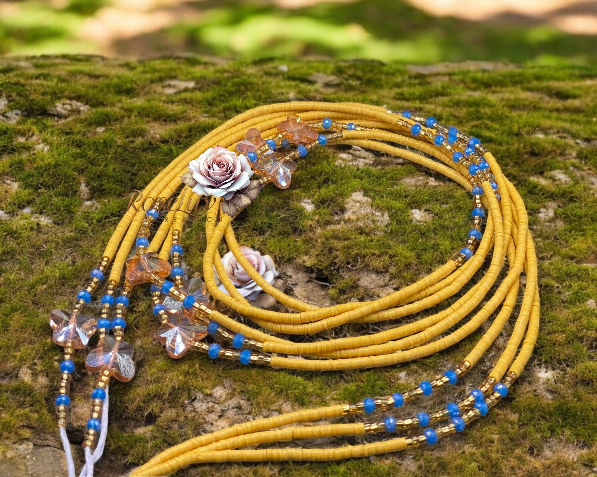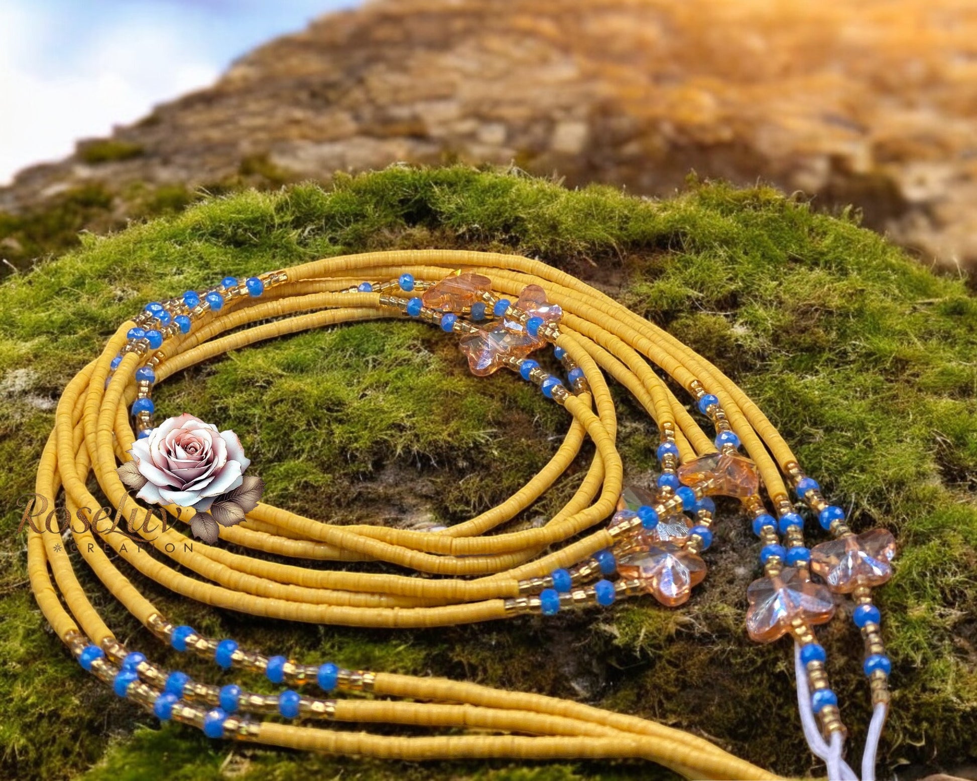 Composées de fines perles plates jaunes, rehaussées de perles bleues éclatantes, de touches dorées et de délicates fleurs translucides, elles incarnent la joie, la liberté et la beauté naturelle.