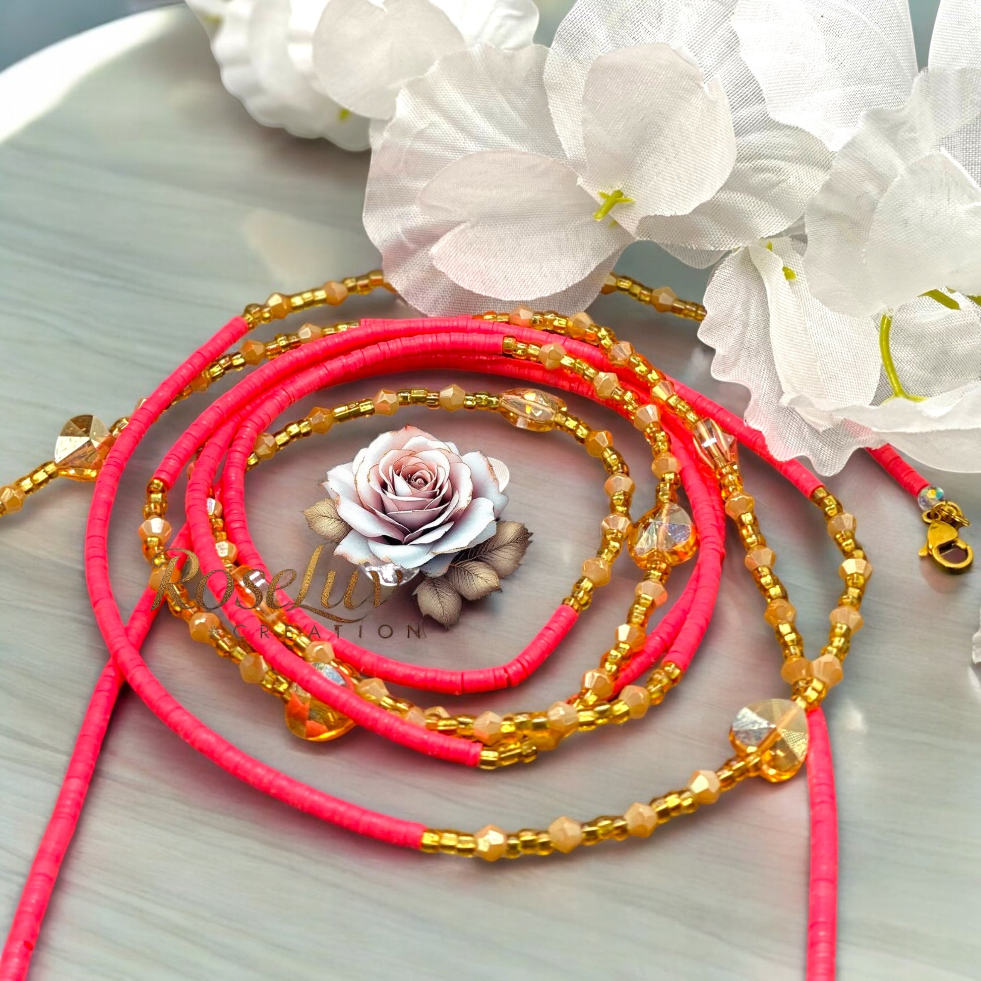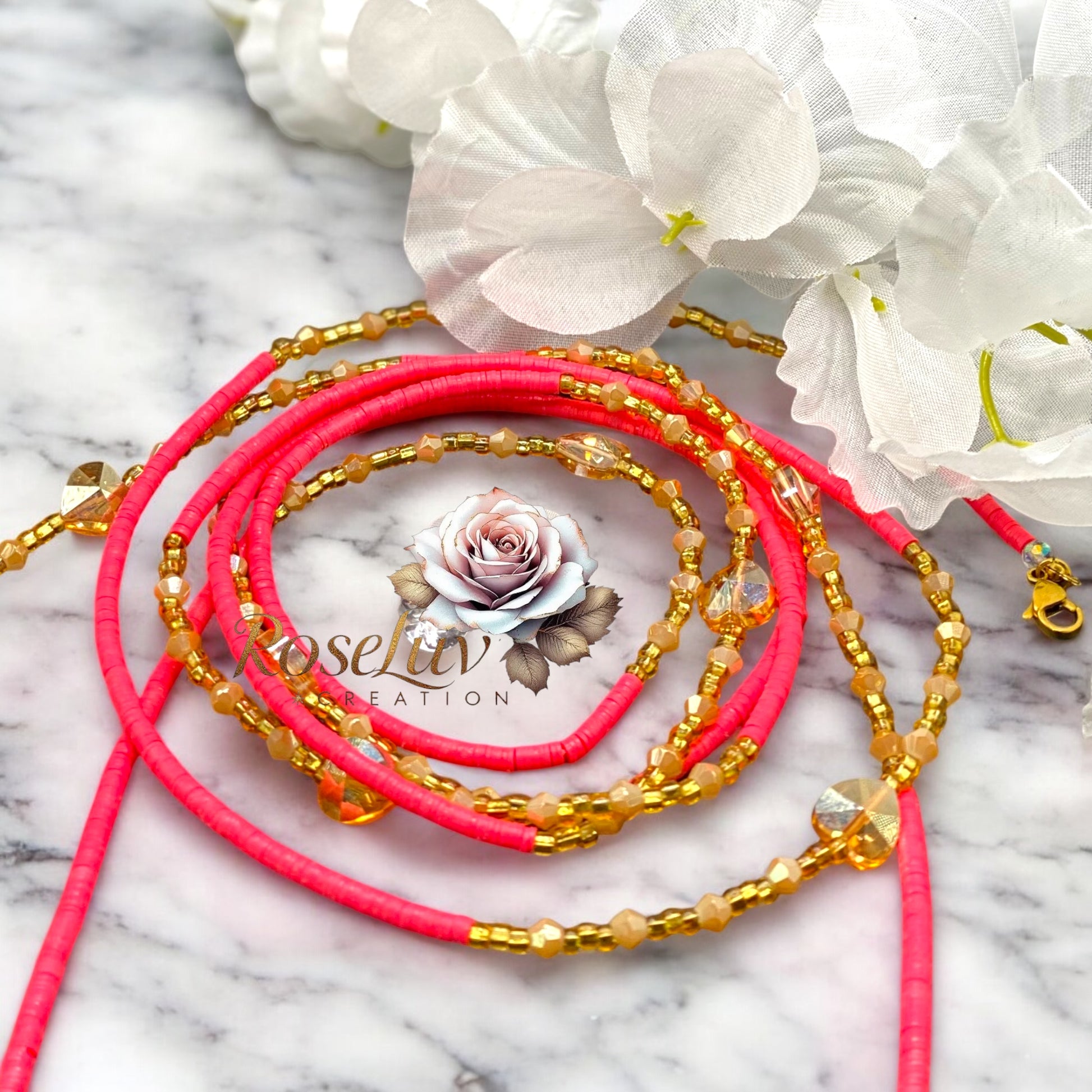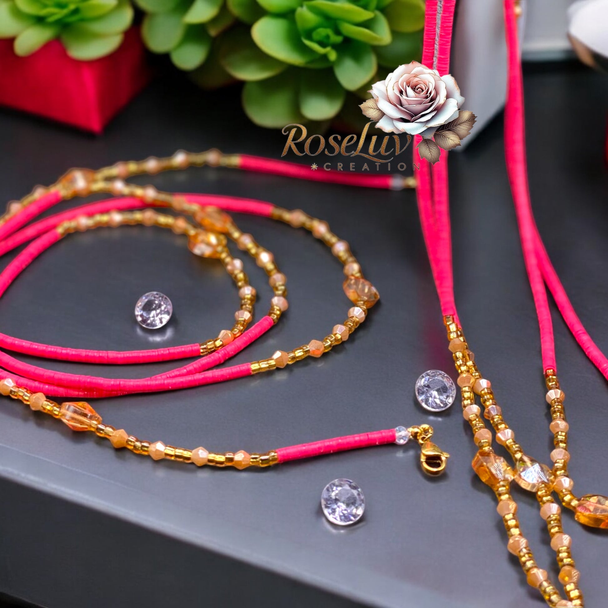 Douce, vibrante et pleine de charme, Rose incarne la féminité dans toute sa splendeur. Ses perles rose vif évoquent la passion et la délicatesse, tandis que les éclats dorés et les cristaux en forme de cœur rappellent la lumière d’un coucher de soleil. Un bijou audacieux et tendre à la fois, conçu pour illuminer la taille avec amour et élégance.