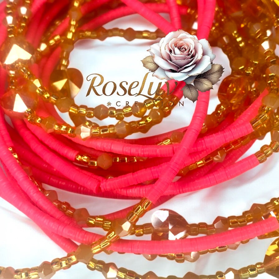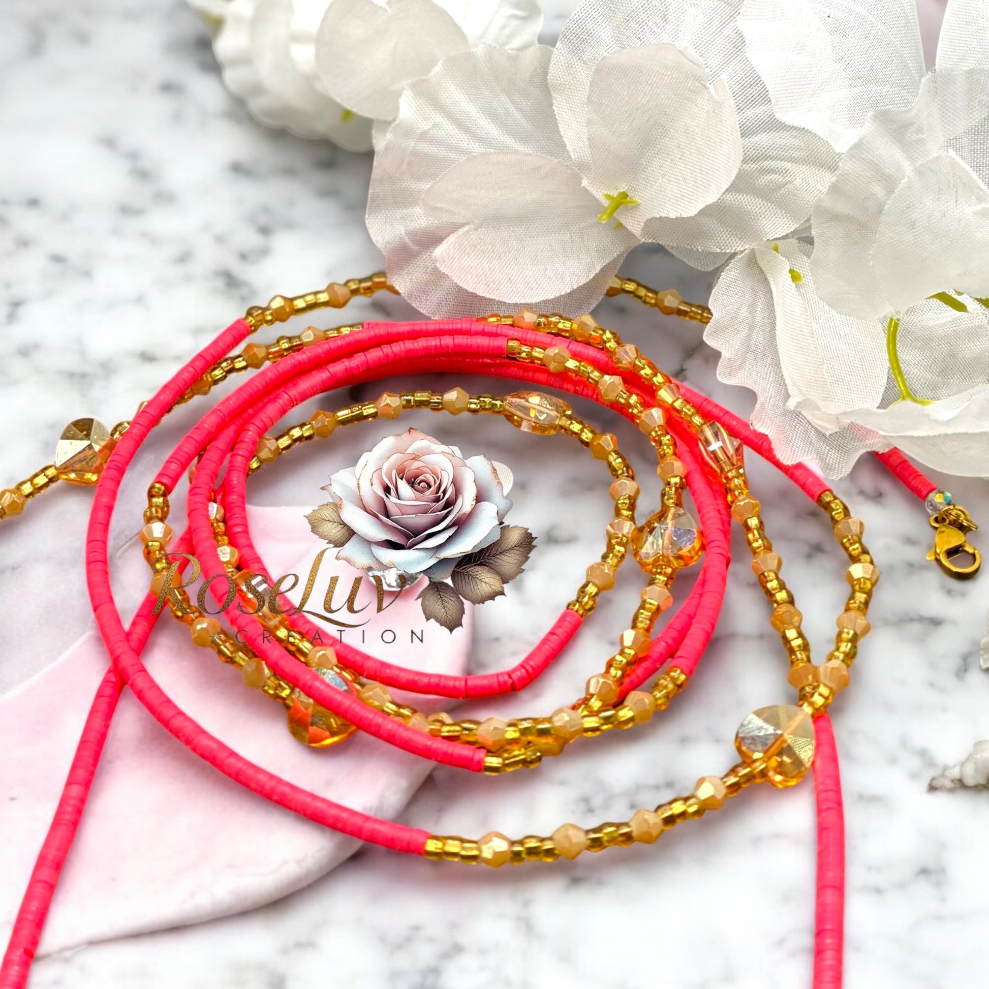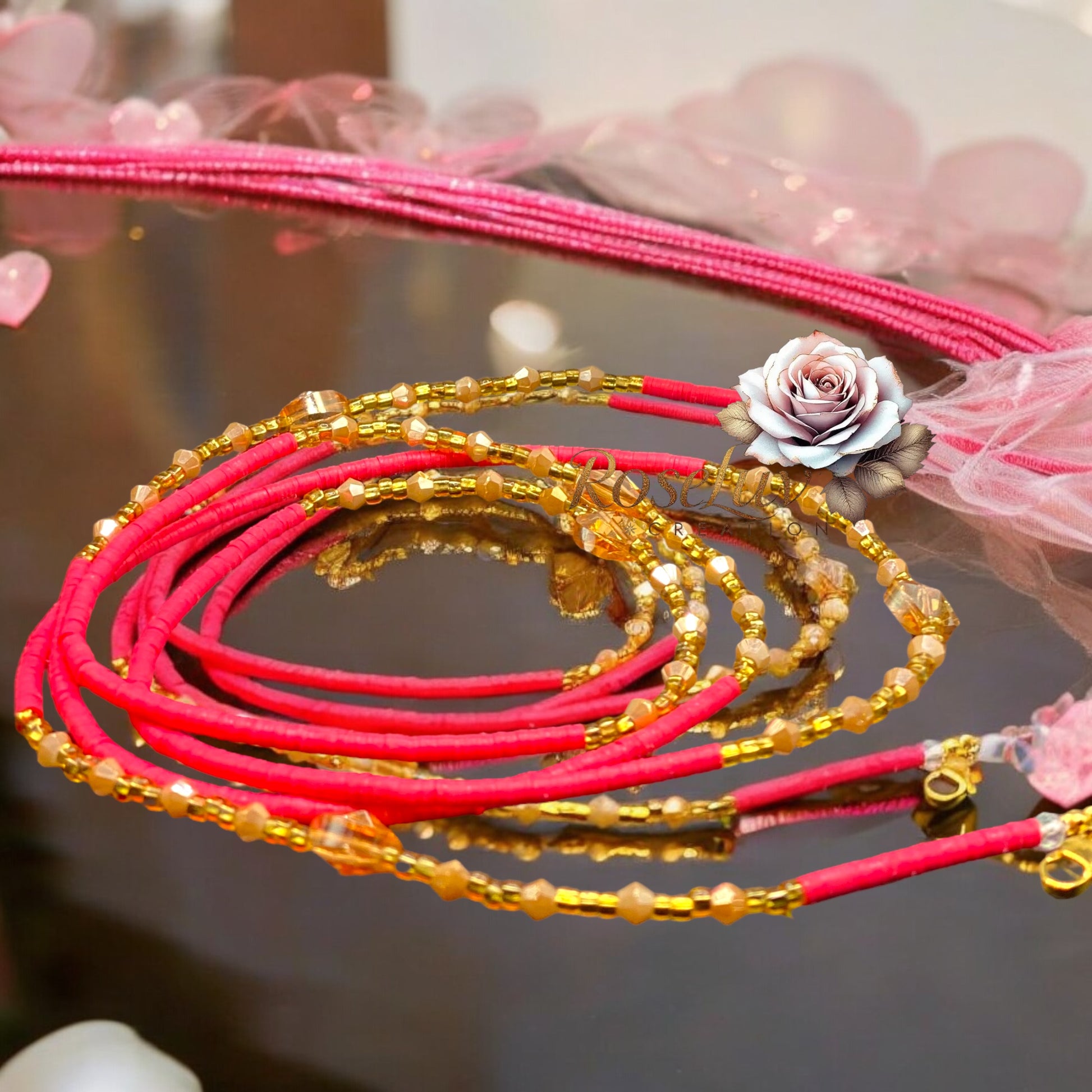 Douce, vibrante et pleine de charme, Rose incarne la féminité dans toute sa splendeur. Ses perles rose vif évoquent la passion et la délicatesse, tandis que les éclats dorés et les cristaux en forme de cœur rappellent la lumière d’un coucher de soleil. Un bijou audacieux et tendre à la fois, conçu pour illuminer la taille avec amour et élégance.