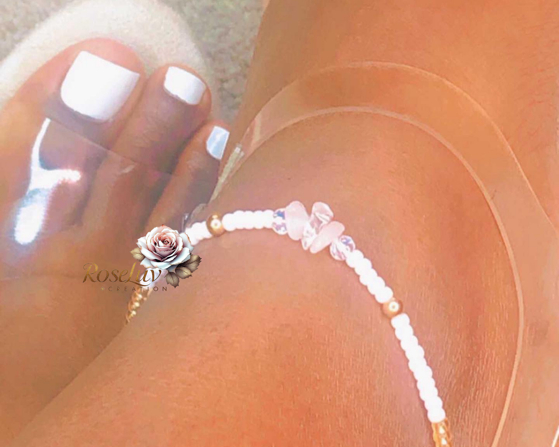 Le bracelet de cheville Rosey incarne la pureté et la féminité avec ses perles blanches immaculées, ses touches dorées lumineuses et ses éclats de quartz rose naturel. Raffiné et romantique, il dégage une aura douce et apaisante, parfaite pour sublimer chaque pas avec élégance.