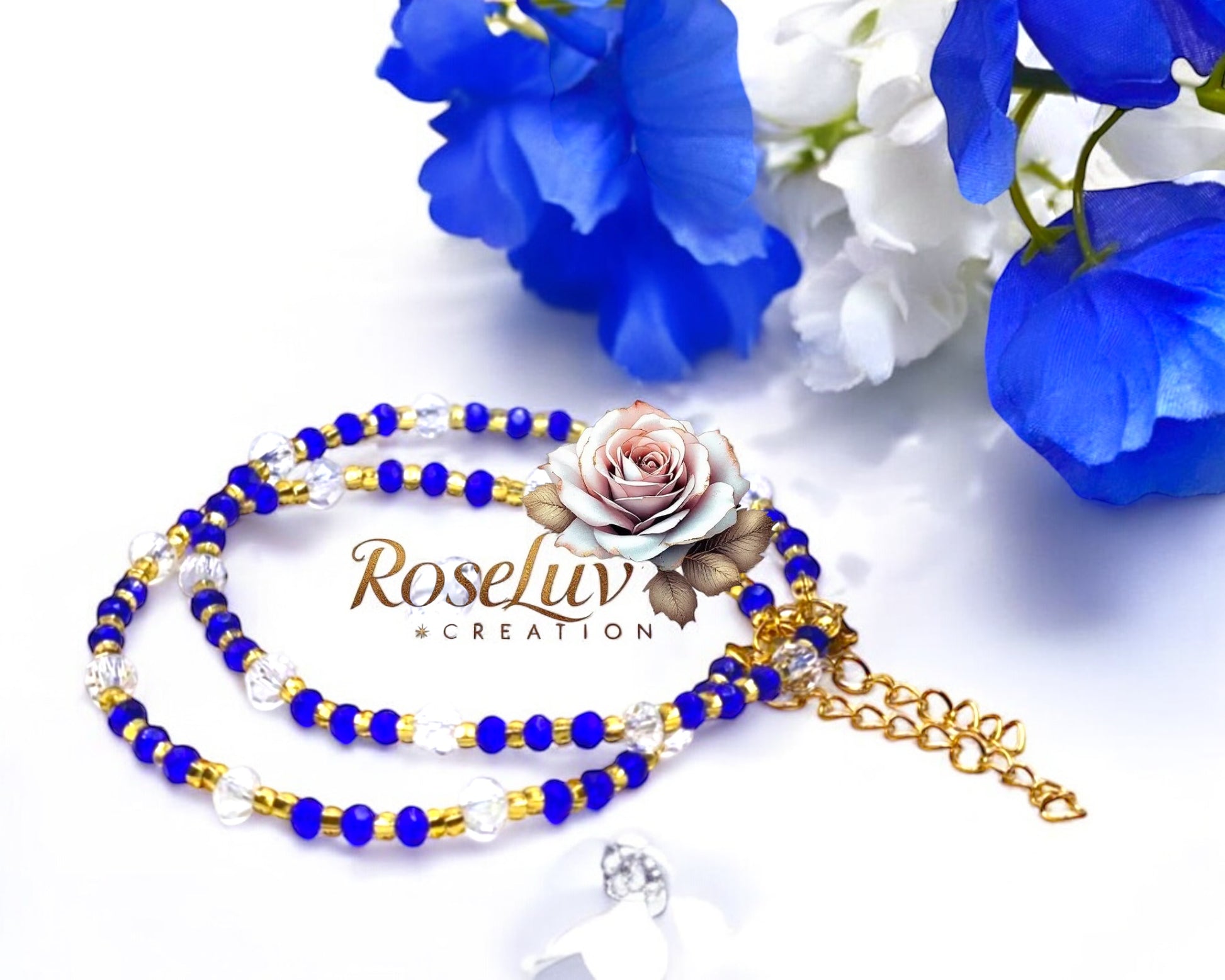 Ce bracelet de cheville “Royal” incarne la grâce et la noblesse. Ses perles bleu profond rappellent la richesse du saphir, tandis que les touches dorées et cristallines apportent lumière et raffinement. Conçu pour sublimer chaque mouvement avec élégance, il se porte comme une déclaration de puissance douce et intemporelle.