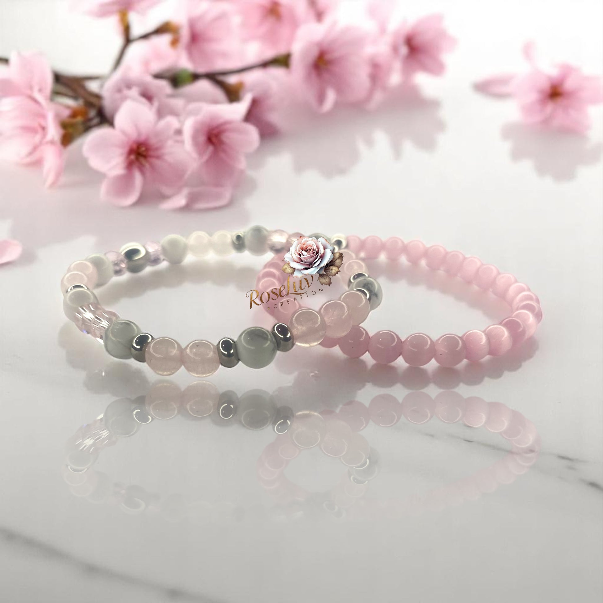 - Le second bracelet, tout en œil de chat rose, reflète la lumière avec un effet soyeux captivant, apportant une touche élégante et féminine.