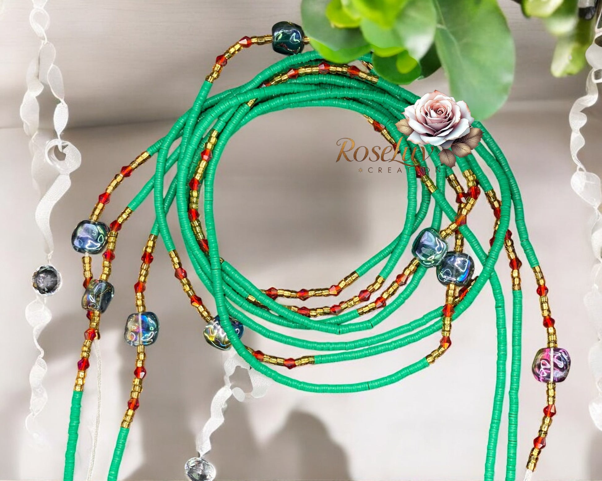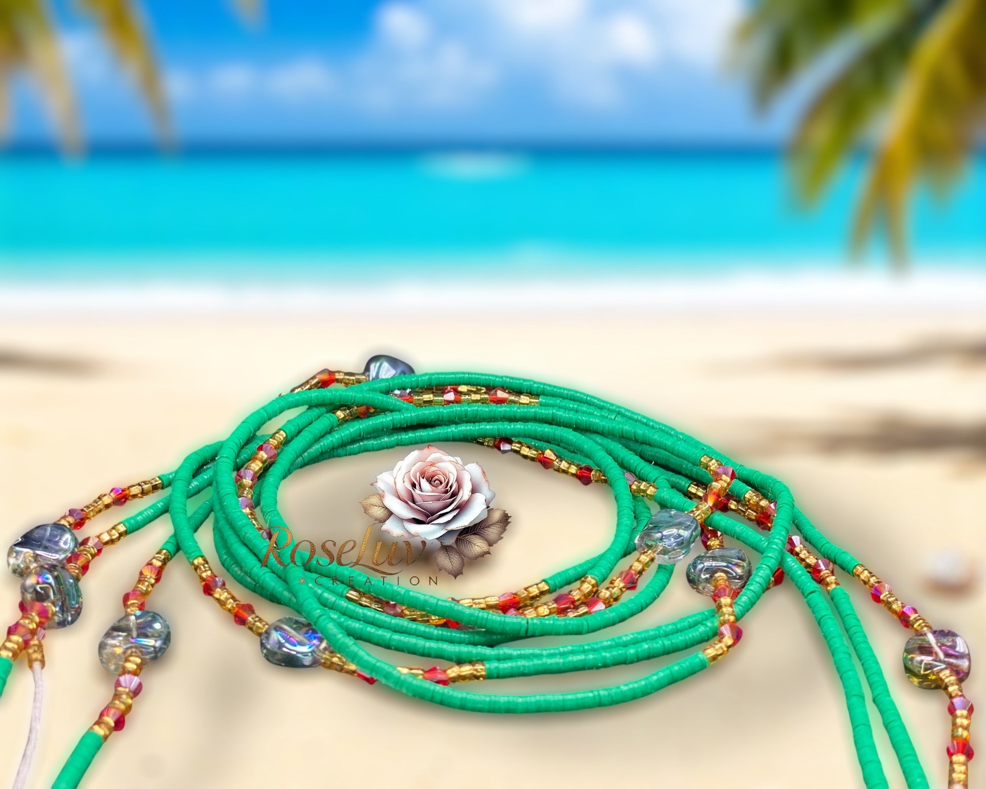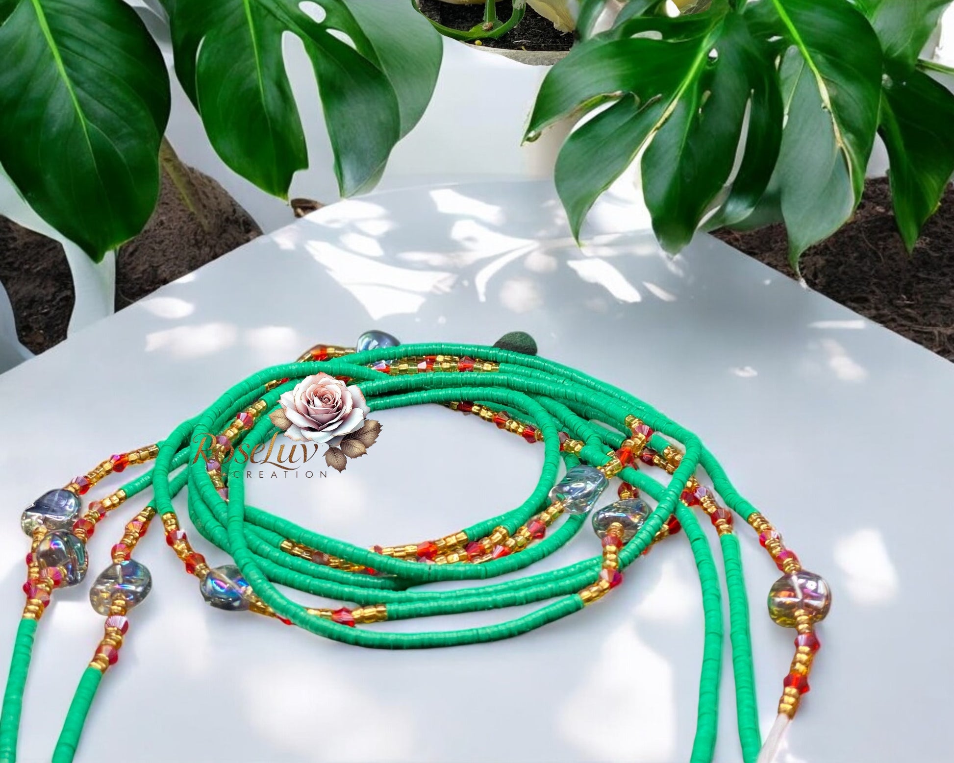 Plongez dans l’ambiance des plages paradisiaques avec notre perle de taille Zayana. Composées de perles plates vert vif en vinyle, sublimées par des touches dorées, rouges éclatantes et des perles transparentes à reflets mystiques, elles évoquent la nature luxuriante et la liberté. Chaque création est pensée pour sublimer vos courbes avec élégance et confiance.