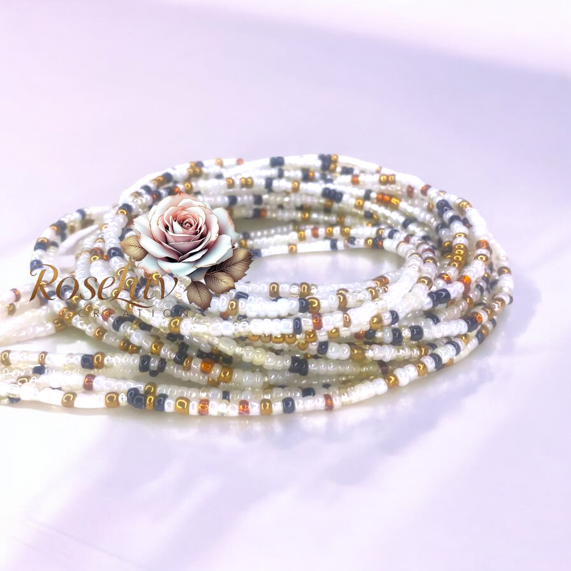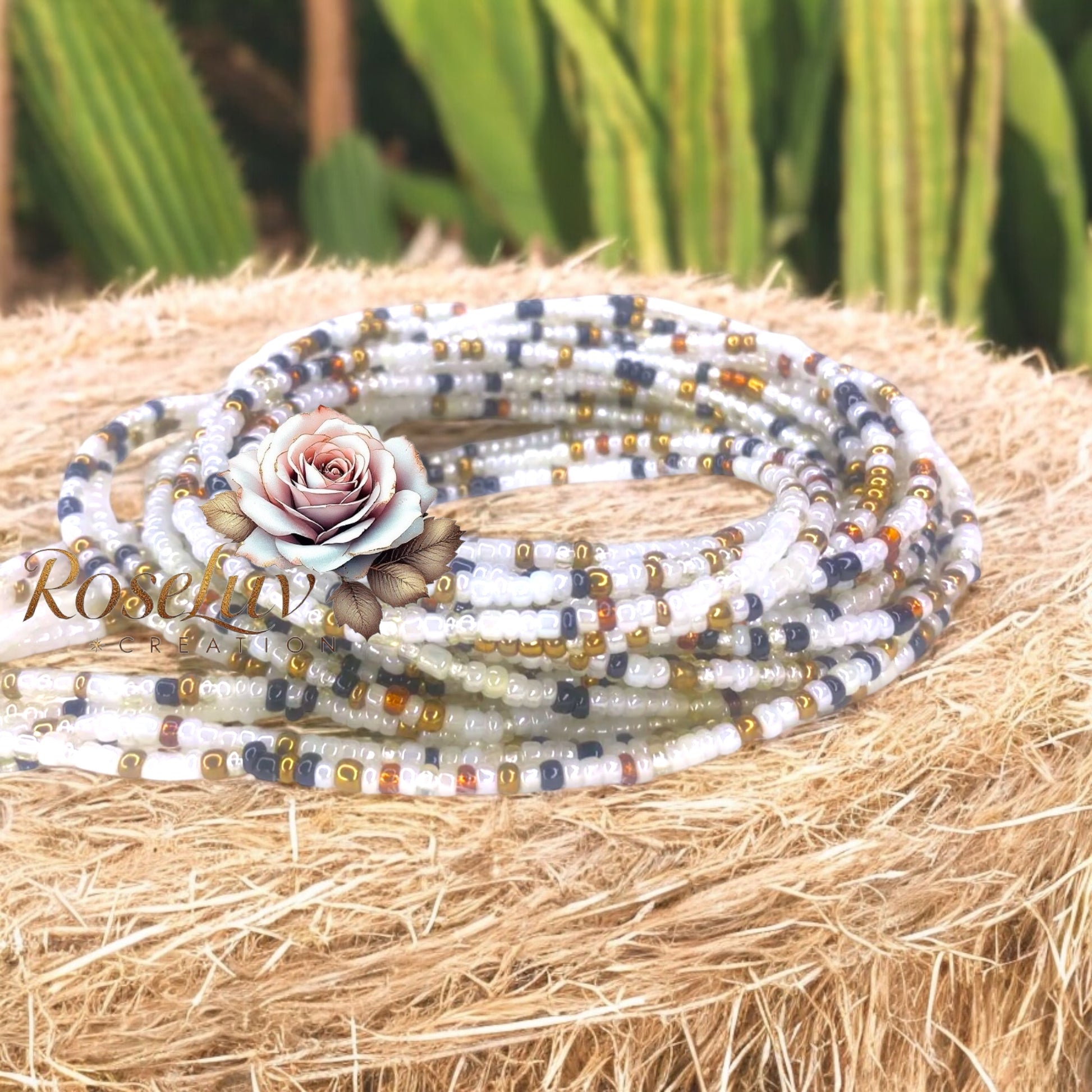 Élégante et intemporelle, cette perle de taille est un mélange harmonieux de blanc nacré, de noir profond, de doré lumineux et de touches cuivrées. Telle une parure discrète mais puissante, elle sublime la silhouette avec raffinement. Les perles fines et délicates glissent autour de la taille comme une seconde peau, apportant une aura de sophistication naturelle à chaque mouvement. Idéale à porter au quotidien ou pour une occasion spéciale, cette création incarne l’équilibre parfait entre modernité et tradition.